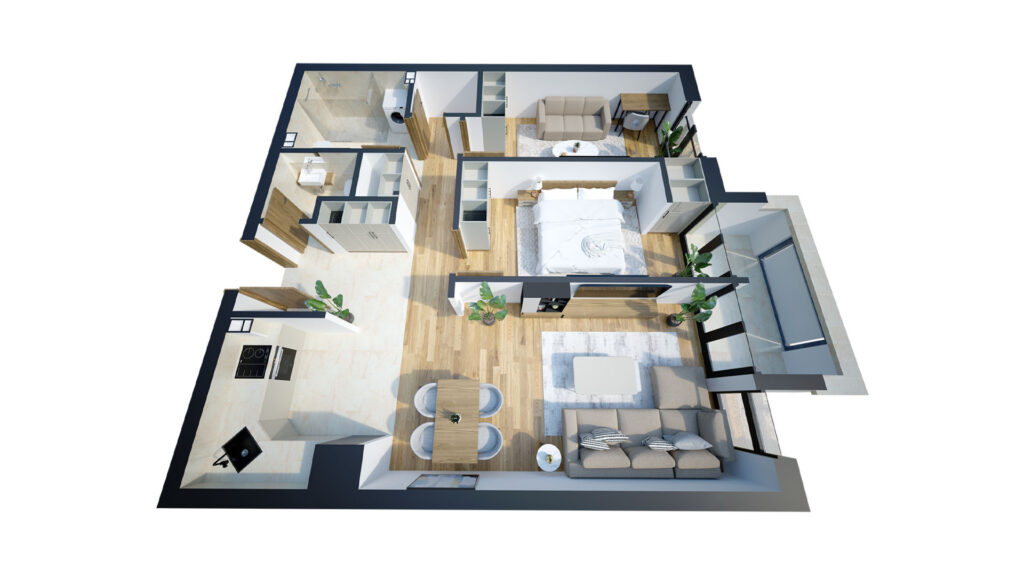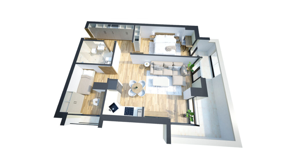 Dvosoban stan sa terasom i ostavom. Nalazi se na 2, 3, 4, 5, 6 i 7. spratu.