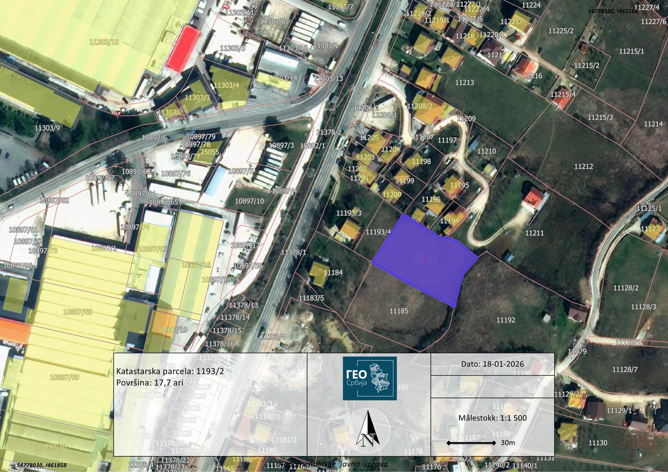 Građevinski plac površine 17,7 ari, katastarska parcela KP 1193/2, nalazi se u Novom Pazaru, u neposrednoj blizini magistralnog puta, na mirnijoj i blago uzdignutoj poziciji. Plac je izdvojen od direktne saobraćajne buke, a istovremeno zadržava odličnu dostupnost glavnim saobraćajnicama.